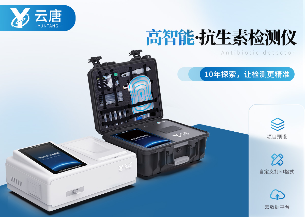 TEL:133-7109-8225 咨询客服山东云唐智能科技有限公司生产的抗生素残留检测仪可现场快速检测抗生素类残留、兽药残留、激素类残留、毒素类残留,化学类残留等多种项目,如可快速检测四环素类、硝基呋喃类、磺胺类、沙星类、喹诺酮类、氯霉素、庆大霉素、链霉素、喹乙醇代谢物、硫酸链霉素、羧苄青霉素、噻孢菌素钠、阿莫西林、氨苄西林、红霉素、潮霉素B、安普霉紊、杆菌肽等抗生素快速检测;还可检测激素类:盐酸克伦特罗、沙丁胺醇、莱克多巴胺、己烯雌酚等,水产兽药:呋喃妥因代谢、呋喃西林代谢、呋喃它酮代谢、呋喃唑酮代谢、孔雀石绿等,毒素类:黄曲酶毒素B1、呕吐毒素、玉米赤霉烯酮、赭曲霉毒素A等,化学类药物:氨丙琳、甲基吡啶磷、阿灭丁、双甲脒、阿散酸、阿维菌素、氮哌酮、苄青霉家、头孢噻呋、克拉维酸、氯羟吡啶等项目。