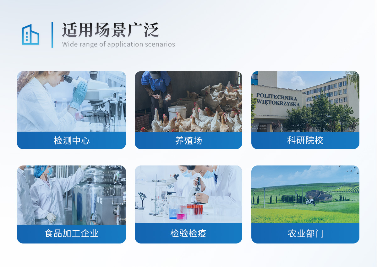 该仪器广泛应用于食药监局、卫生监督部门、农业部门、商业系统养殖场、屠宰场、食品肉产品深加工企业、畜牧兽医、检验检疫部门、食品生产企业、农副产品批发市场、农业生产基地、超市、餐厅、高教院校、食堂等单位部门对食品中的不安全指标进行监测使用。