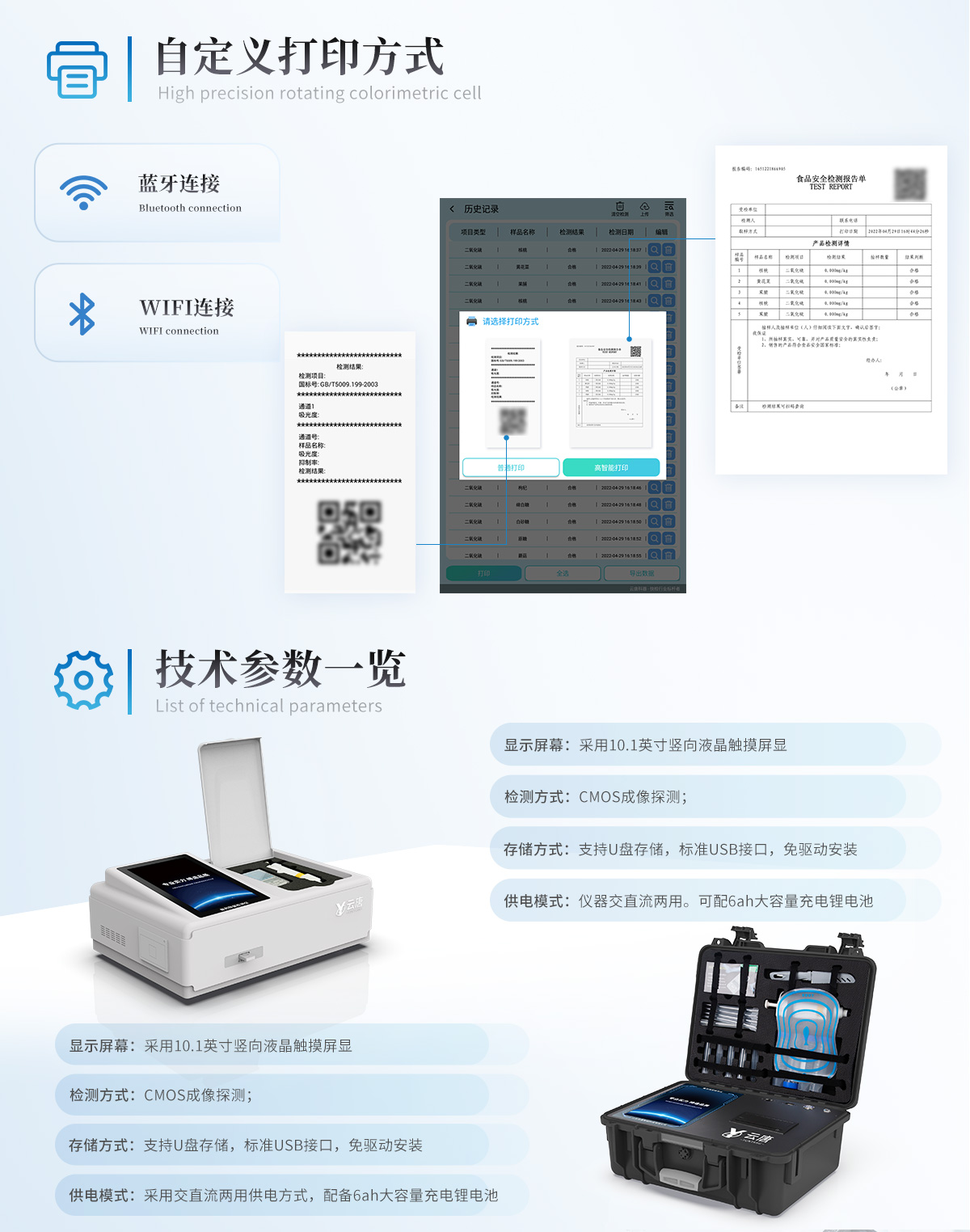 3.一体化台式快检设备,采用交直流两用供电方式,可连接车载电源,配备6ah大容量充电锂电池,可以满足现场及流动检测使用的需求。仪器尺寸:43×35×20cm, 主机净重:5.1kg