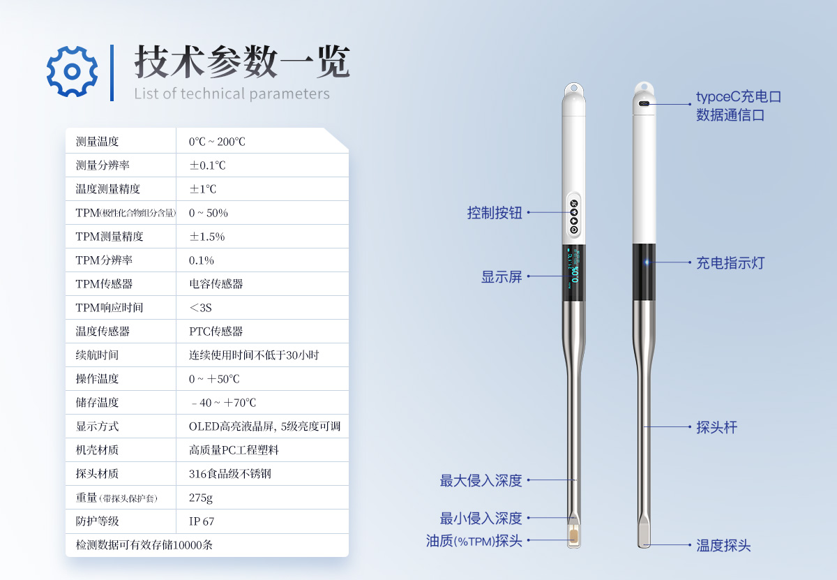 TEL:133-7109-8225 咨询客服食用油脂是人们摄取能量和营养的重要来源,是加工食品的重要原料。油炸食品以其特有风味广受消费者喜欢。用于煎炸的食用油在高温煎炸过程中发生一系列的物理、化学变化,这些变化会生成对身体健康有害的物质。目前,煎炸食用油的传统检测方法多为化学方法,这些方法必须在实验室内由专业人员操作,费时费力,化学试剂的使用可能会伤害检测人员健康,且化学废剂污染了环境。YT-SYP是一种快速,安全,**食用油品质检测仪,能够快速检测食用油中的极性化合物组分含量。本产品能够在油温较高的环境下使用,适用于各种煎炸的食用油品质检验。