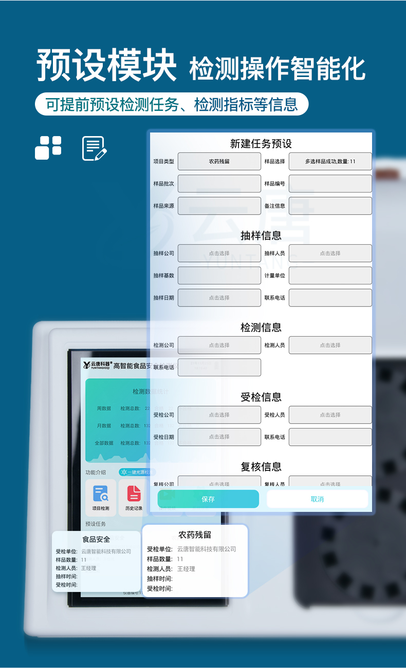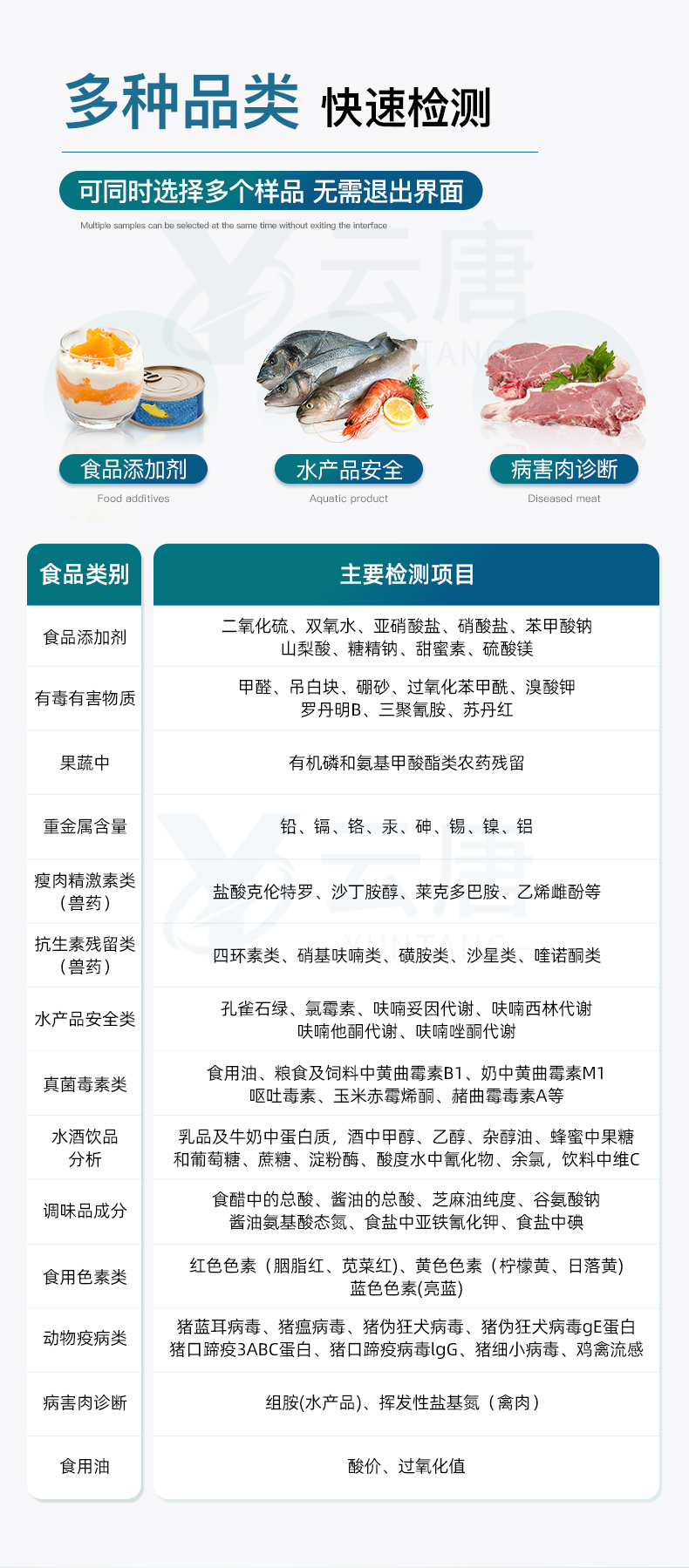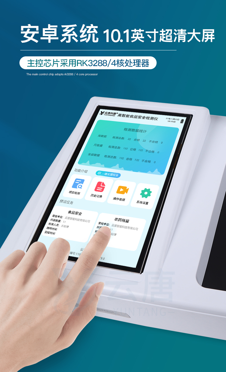 山东云唐智能科技有限公司生产的高智能食品安全检测仪为集成化食品安全快速检测分析设备,采用台式一体化设计,可快速检测200多种食品安全项目,包含非食用化学物质、滥用食品添加剂、农药残留、兽药残留、重金属、病害肉、营养强化剂、抗生素类残留、激素类残留、真菌毒素类残留、化学类残留等项目的定性定量检测。