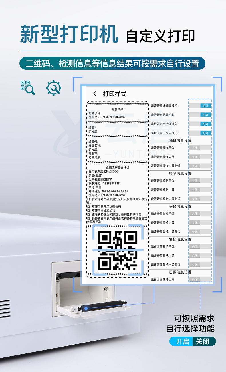 ★自定义打印系统:内置热敏打印机;系统打印格式多样化,产品合格证(国家农业部标准要求),二维码,抽样信息、检测信息,受检信息、复核信息、抽样日期、检测日期等信息结果,可按实际需求自行设置开启或关闭,完成打印。(需提供对应证明)