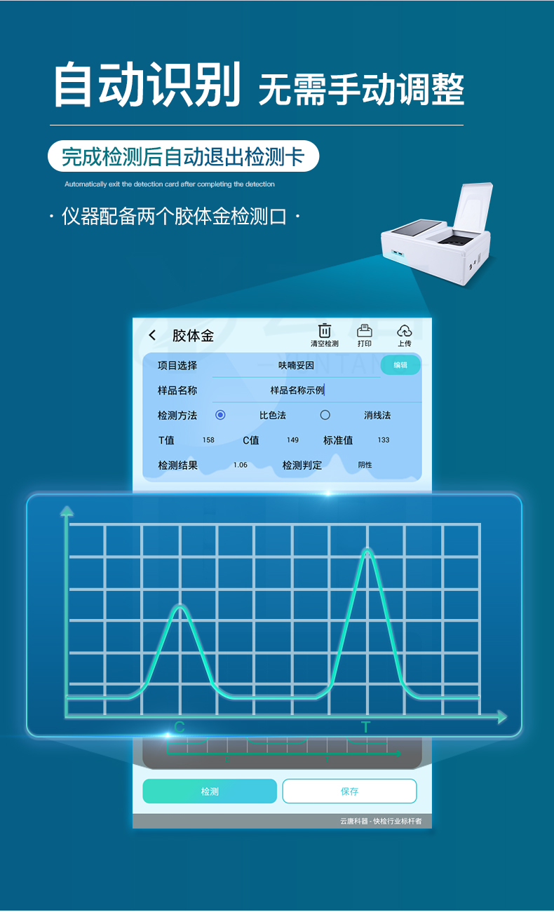 6)胶体金模块检测方式:单通道CMOS成像探测,插入式自动传输扫描。