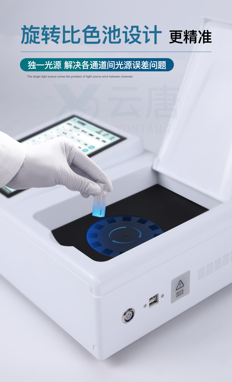 5)光源:进口高精四波长冷光源,每个通道均配置 410、520、590、630nm 波长光源,设备具备开机自动校准及一键校准功能,确保检测数据结果准确。