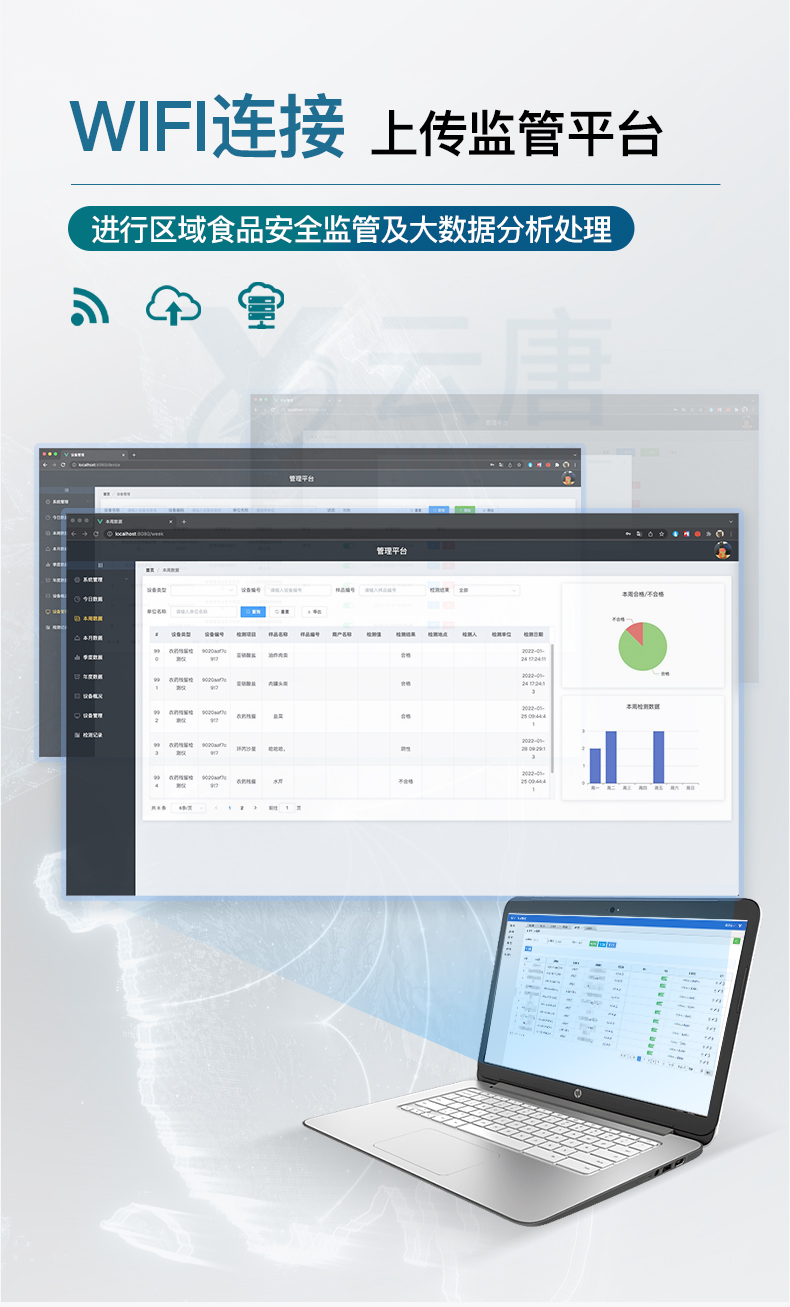 ★数据监管系统:同步对接监管平台,数据可局域网和互联网数据上传,检测结果可选择直接传至食品安全监管平台。进行区域食品安全监管及大数据分析处理与数据统计,检测区域食品安全长短期动态,达到食品安全问题预估、预警。(需提供对应食品理化分析系统计算机软件著作权)。